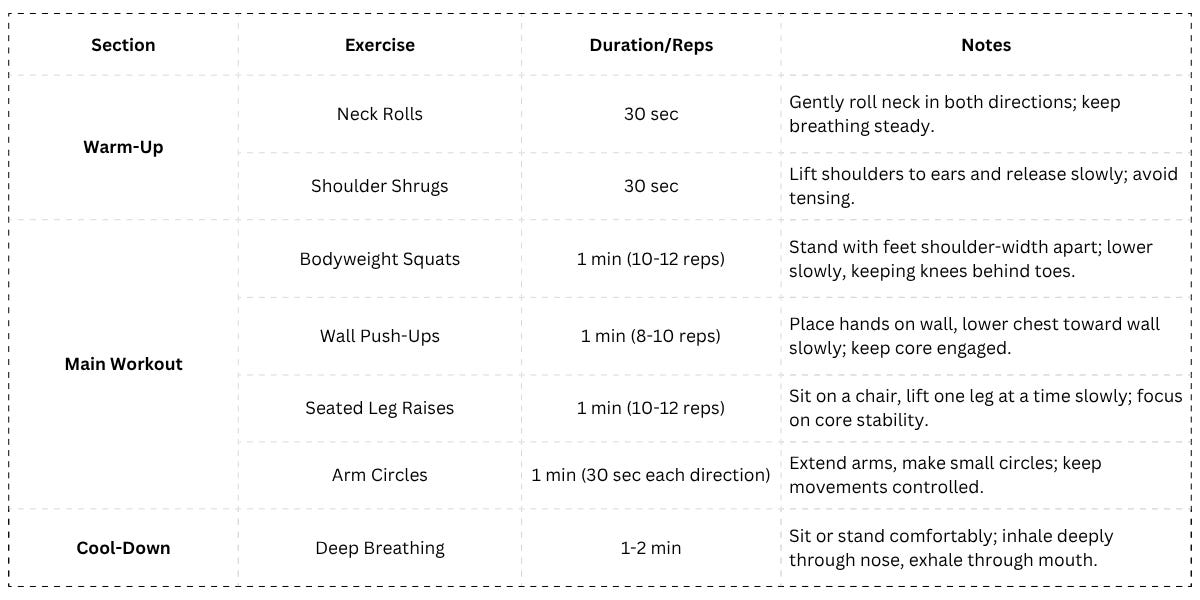 This 5-7 minute full-body micro-workout is designed to be gentle, effective, and calming, avoiding rapid heart rate increases while building strength and confidence. Perform it three times a week (e.g., Monday, Wednesday, Friday). Focus on slow, controlled movements and steady breathing (inhale through the nose, exhale through the mouth). No equipment is needed. If you feel discomfort, pause and resume when ready.